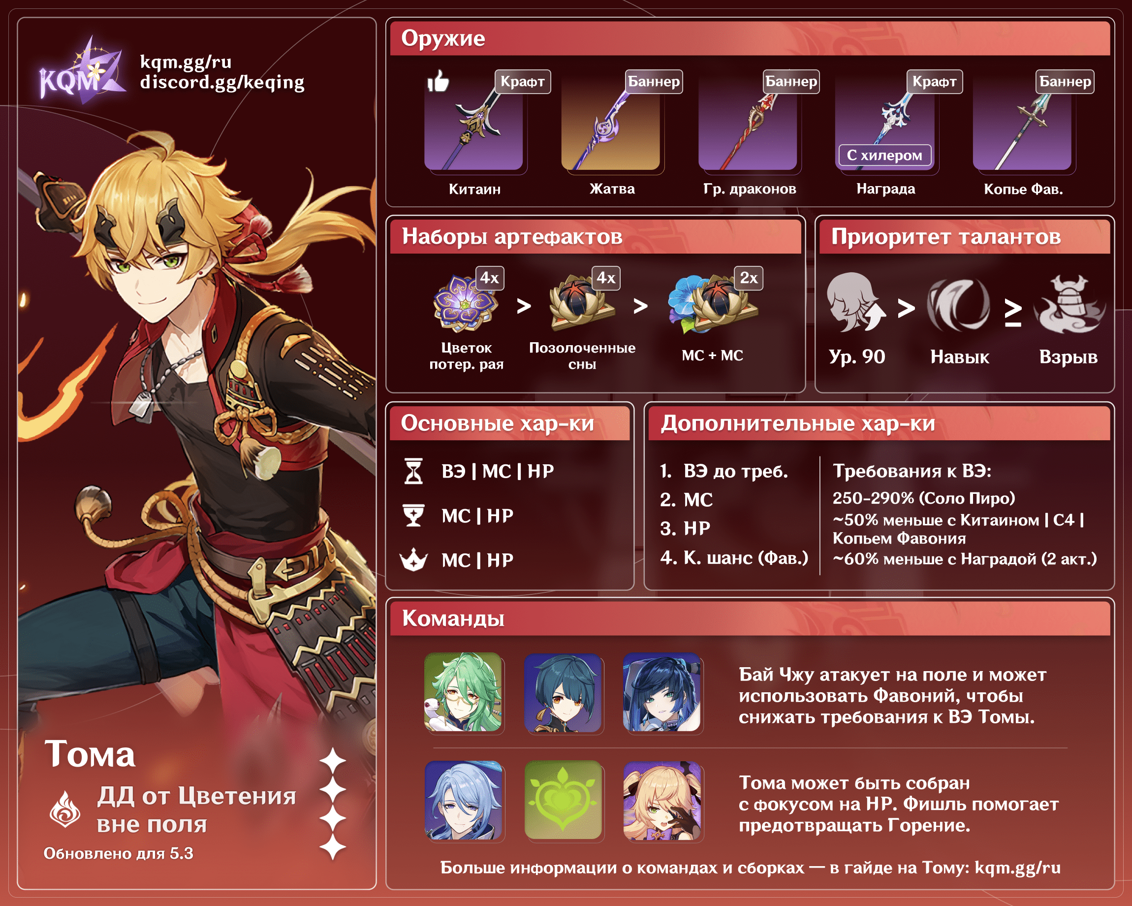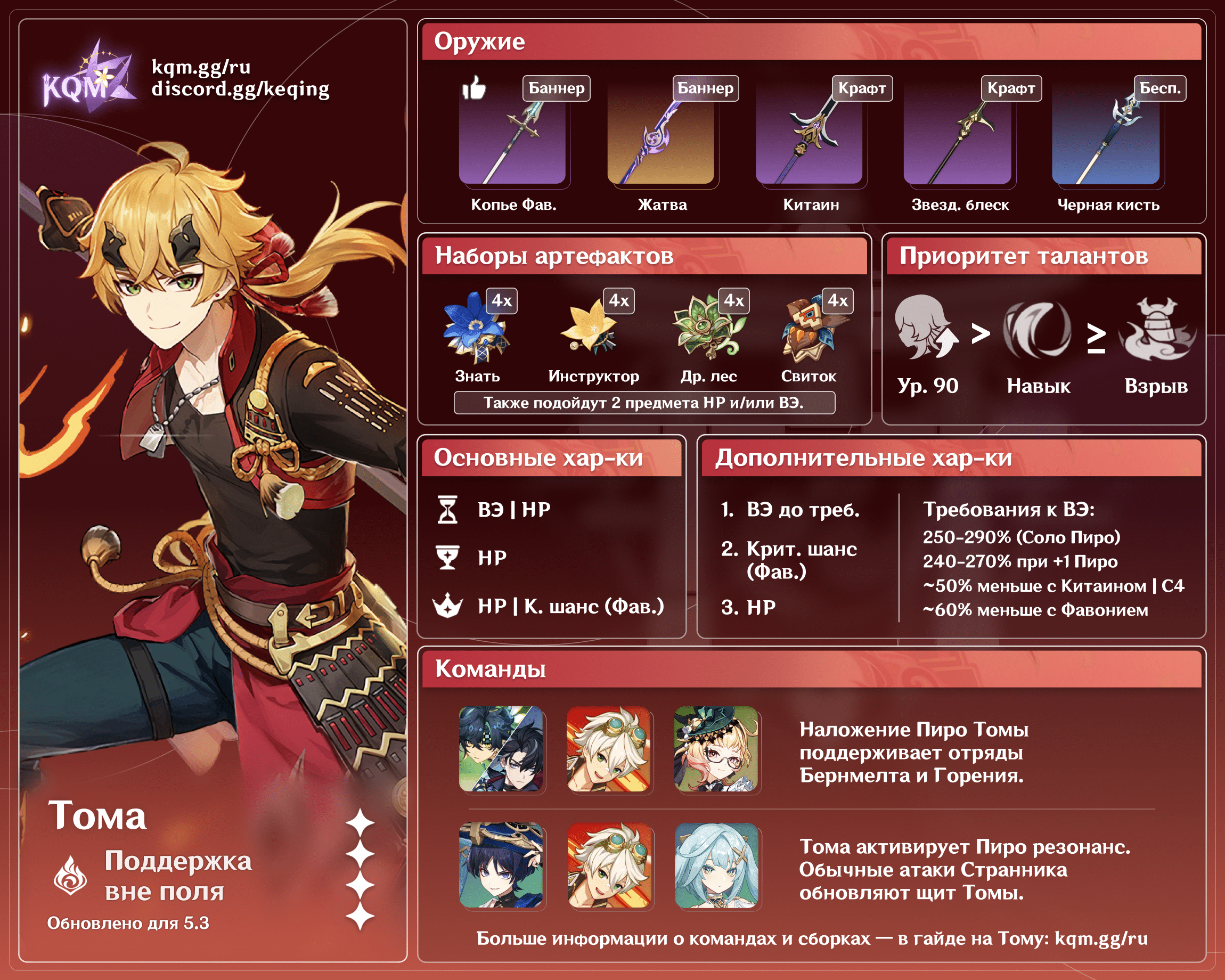 Тома — 4-звездочный Пиро копейщик в Genshin Impact, часто используемый вне поля боя как щитовик или как триггер реакции Цветение. Из этого краткого гайда вы узнаете о лучших билдах, оружии, артефактах и отрядах для Томы.