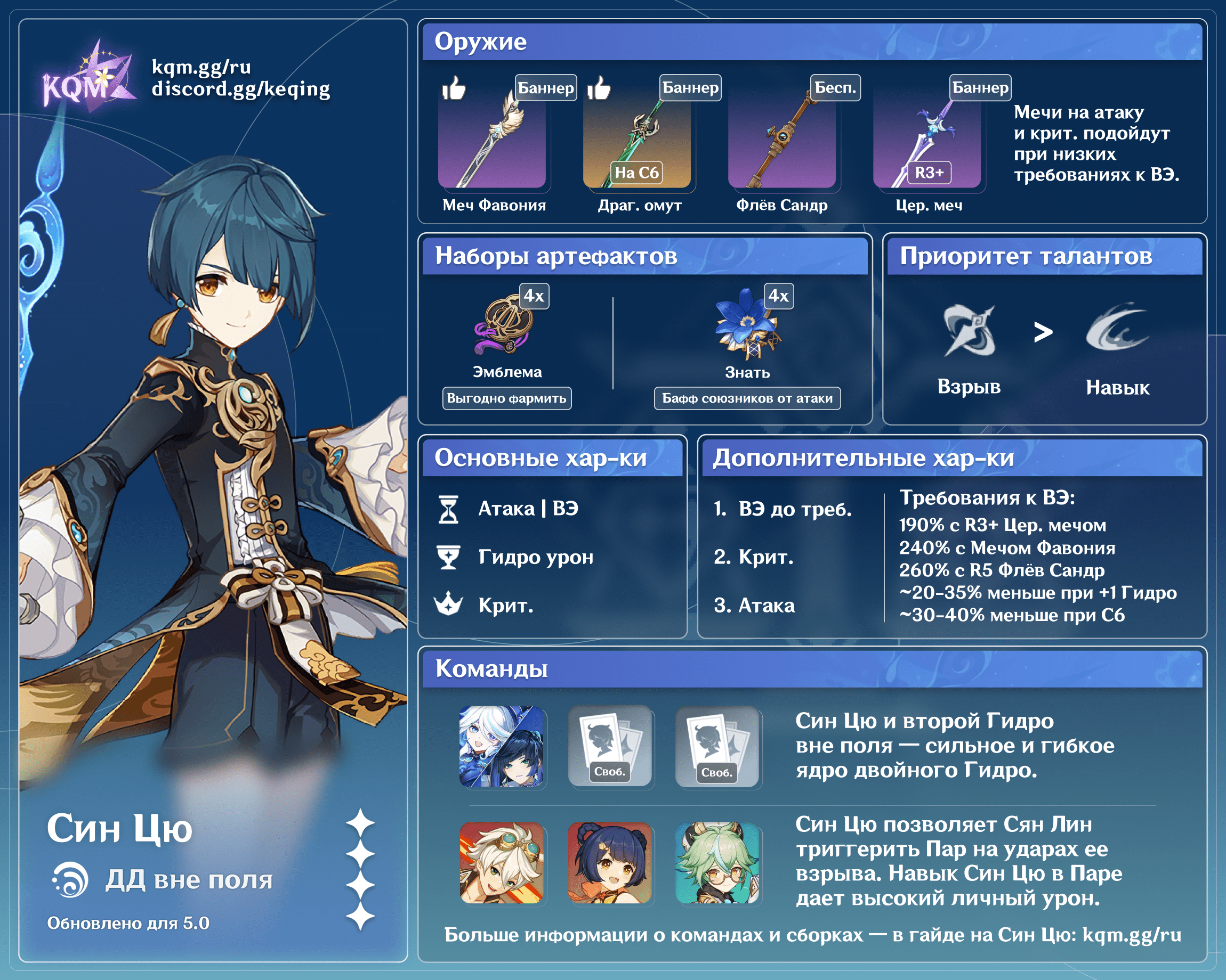 Син Цю — 4-звездочный Гидро мечник в Genshin Impact, чьи сильные стороны включают в себя стабильное наложение Гидро статуса и урон по одной цели из-за пределов поля. В этом гайде вы узнаете о лучших сборках, оружии, артефактах и отрядах для Син Цю.