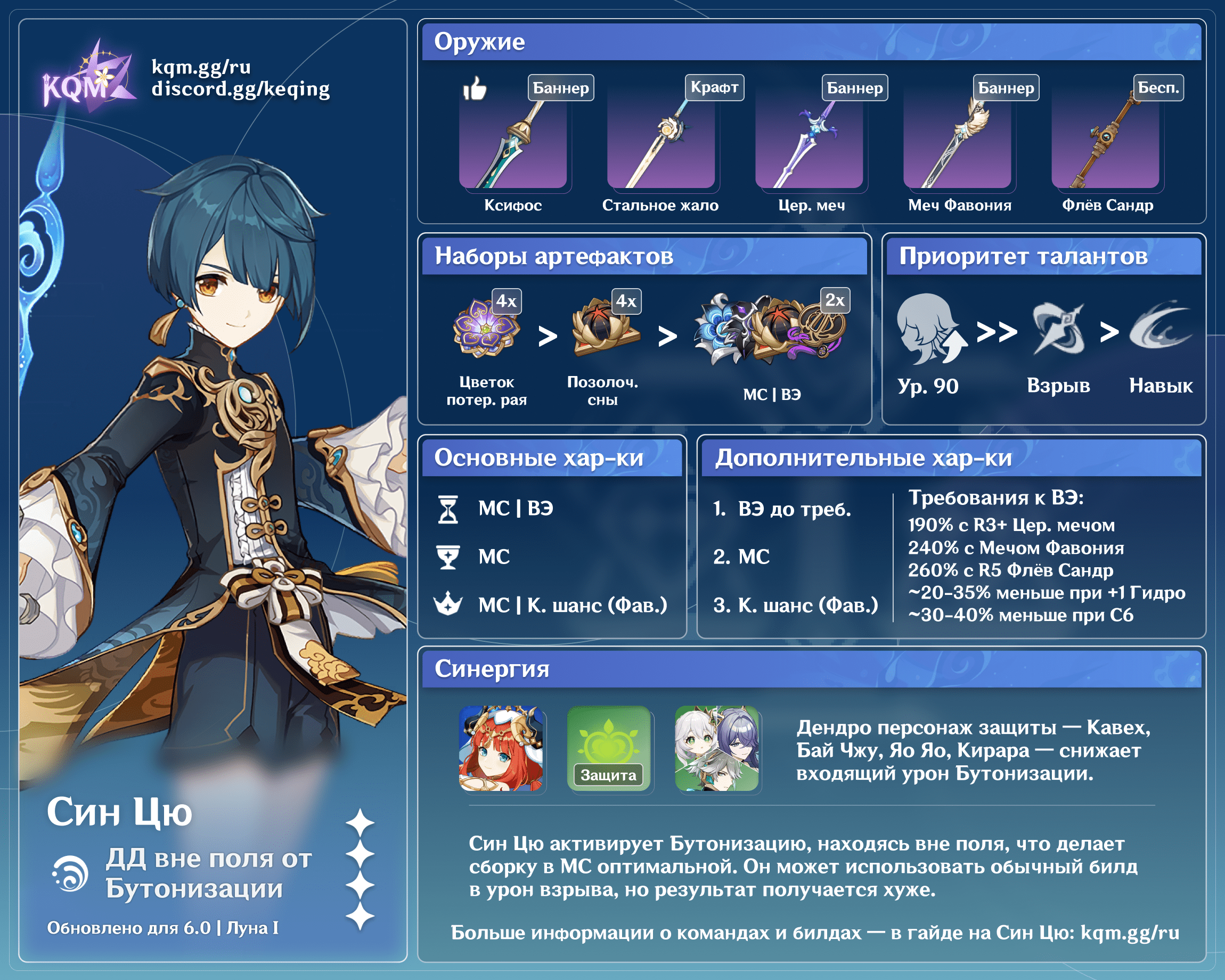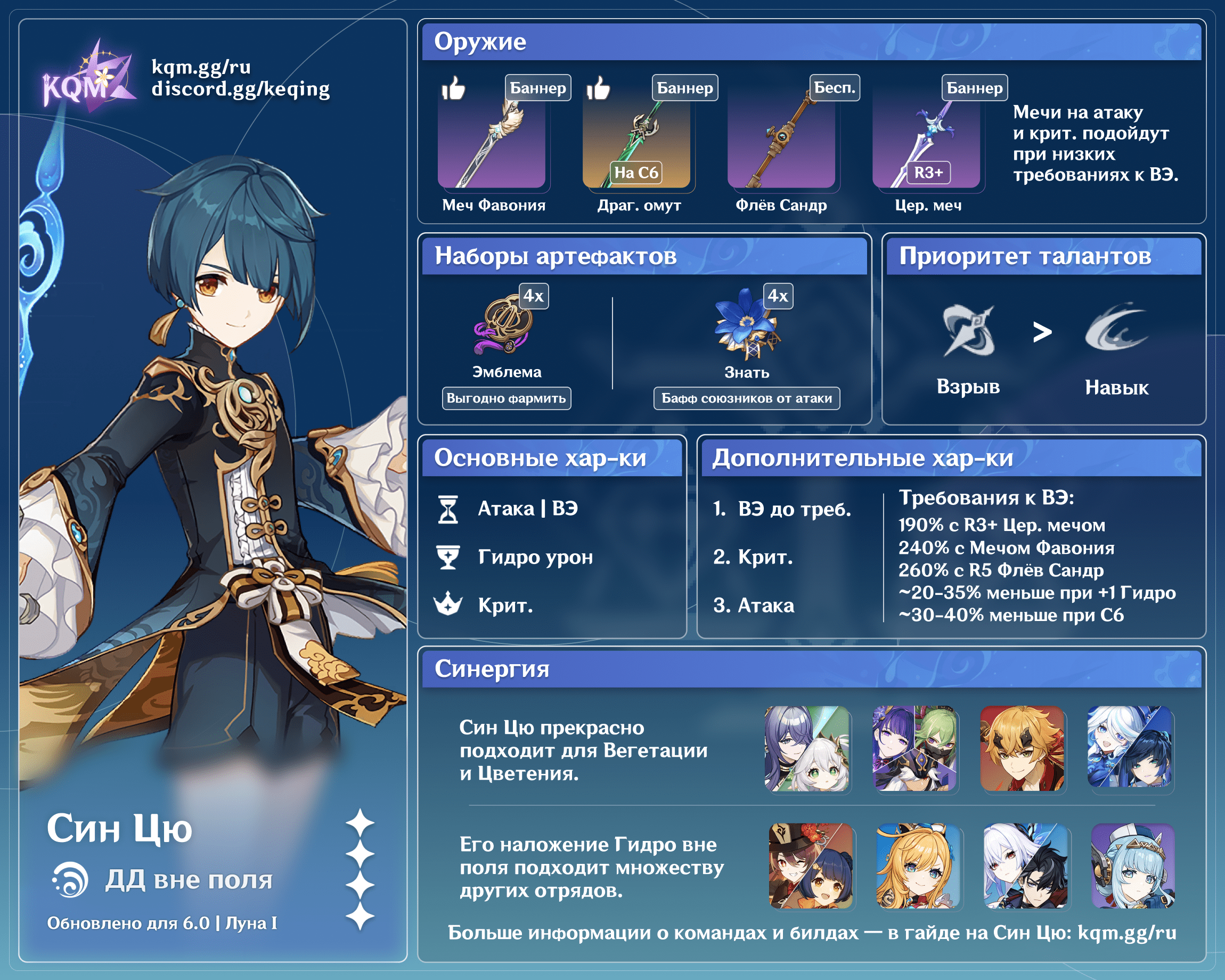 Син Цю — 4-звездочный Гидро мечник в Genshin Impact, чьи сильные стороны — стабильное наложение Гидро статуса и урон по одной цели из-за пределов поля. В этом гайде вы узнаете о лучших билдах, оружии, артефактах и отрядах для Син Цю.