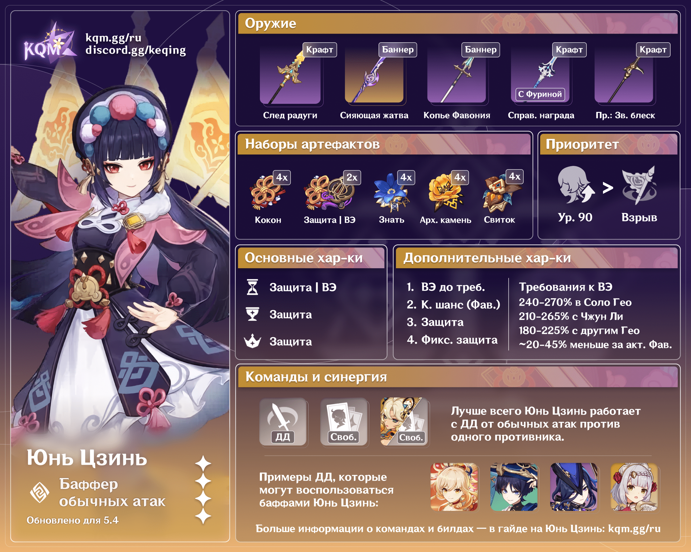 Бафф Юнь Цзинь привязан к ее взрыву стихии, а значит, достичь требований к ВЭ чрезвычайно важно. С Копьем Фавония на низких рангах пробуждения можно рассмотреть корону на шанс крит. попадания. Бонус урона Юнь Цзинь пропорционален защите, что определяет рекомендованную сборку.