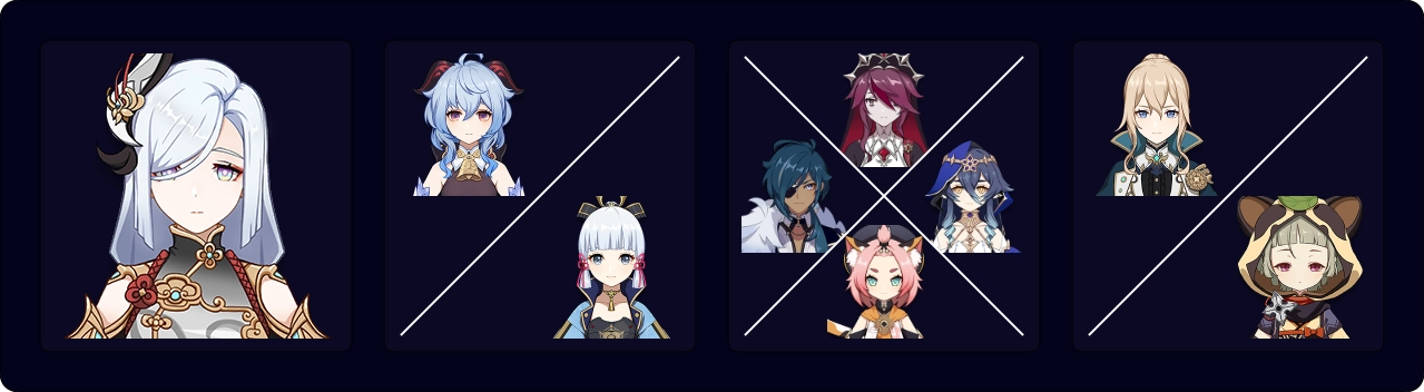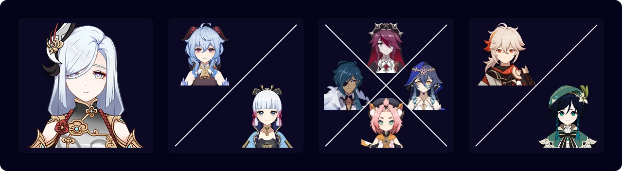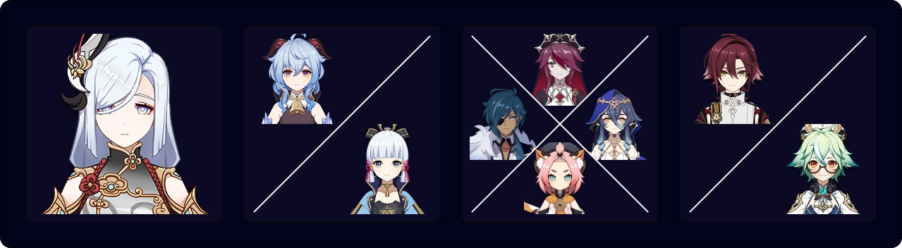 In scenarios where Freeze is either undesirable or just impossible, such as against Bosses, these teams are a good option. Having more Cryo units, each with their own quota of Icy Quill procs, increases Shenhe’s value in the team. Furthermore, the high amount of Cryo Particle generation significantly reduces ER requirements. In some scenarios, such as when facing enemies that cannot be Frozen, this team is one of the best options.