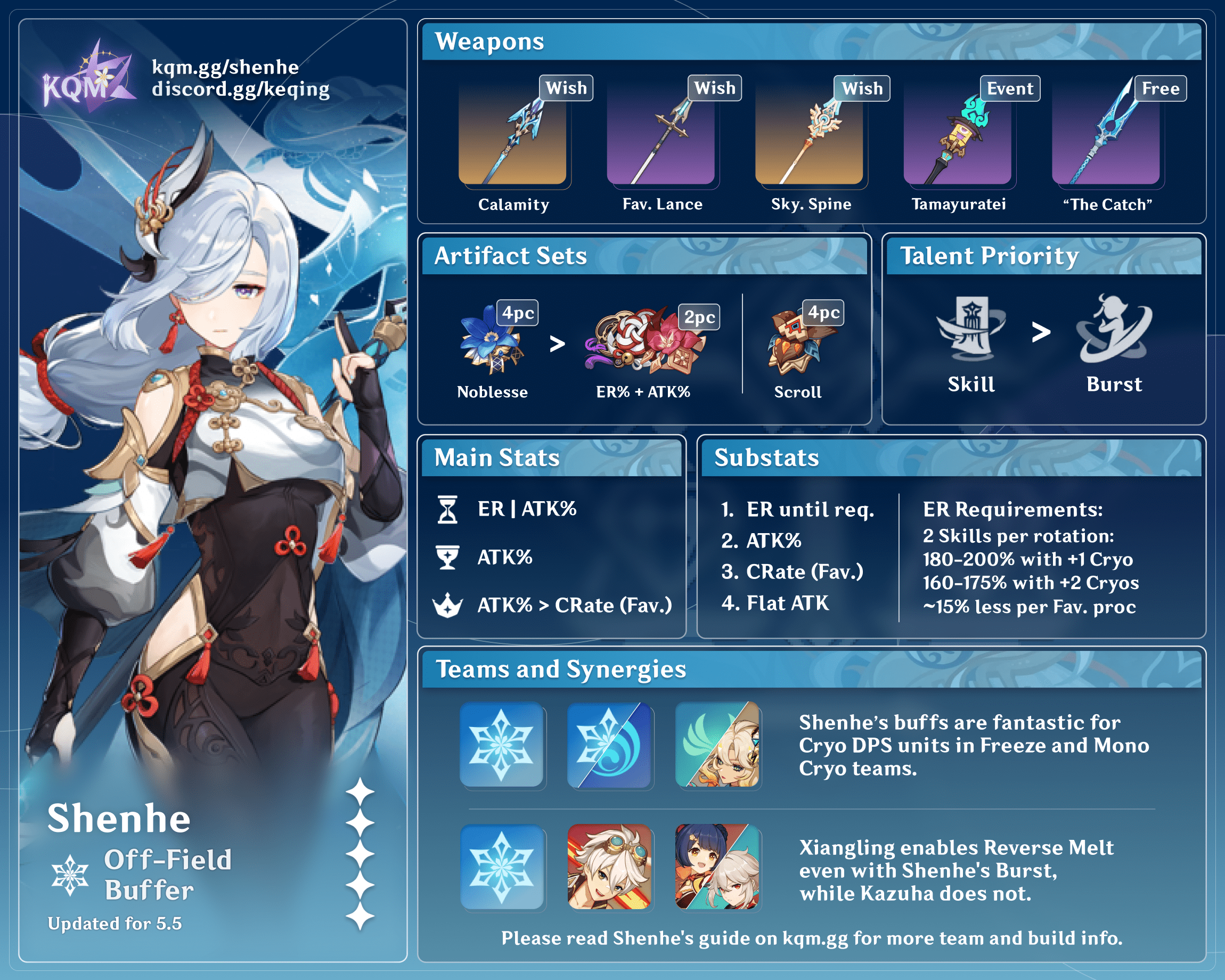 Shenhe is a 5-star Cryo Polearm character in Genshin Impact who specializes in off-field support for Cryo DPS units. Shenhe is the premiere Cryo support in most Cryo damage focused teams that can utilize her buffs and debuffs. This guide will review her best builds, best weapons, best artifacts, best teams, Talent priority, team rotations, and much more!