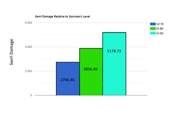 Significance: As shown in the graph, reaction damage increases exponentially as her level increases. The 80 -> 90 level jump creates a roughly 34% increase in her Transformative Reaction damage, and hence it is ideal to prioritize Sucrose’s character level over both her Talents and her artifacts, assuming you already have a VV 4pc set bonus. This can be seen a bit more clearly in her Swirl damage in the graph below.
