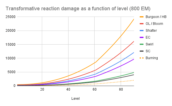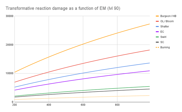 - Reaction damage scales off Elemental Mastery and character level, but also benefits from DMG% bonuses and CRIT