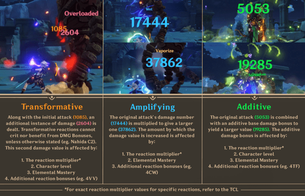 Genshin Impact contains various Elemental Reactions that can be categorized as Transformative, Amplifying, or Additive. This guide will not go through all properties of every reaction, but here is a short table of what is related to Sucrose’s Elemental Mastery application. As Sucrose is generally built to maximize her Elemental Mastery without regard for CRIT stats, she tends to focus on doing Transformative/Additive Reactions when on-field.