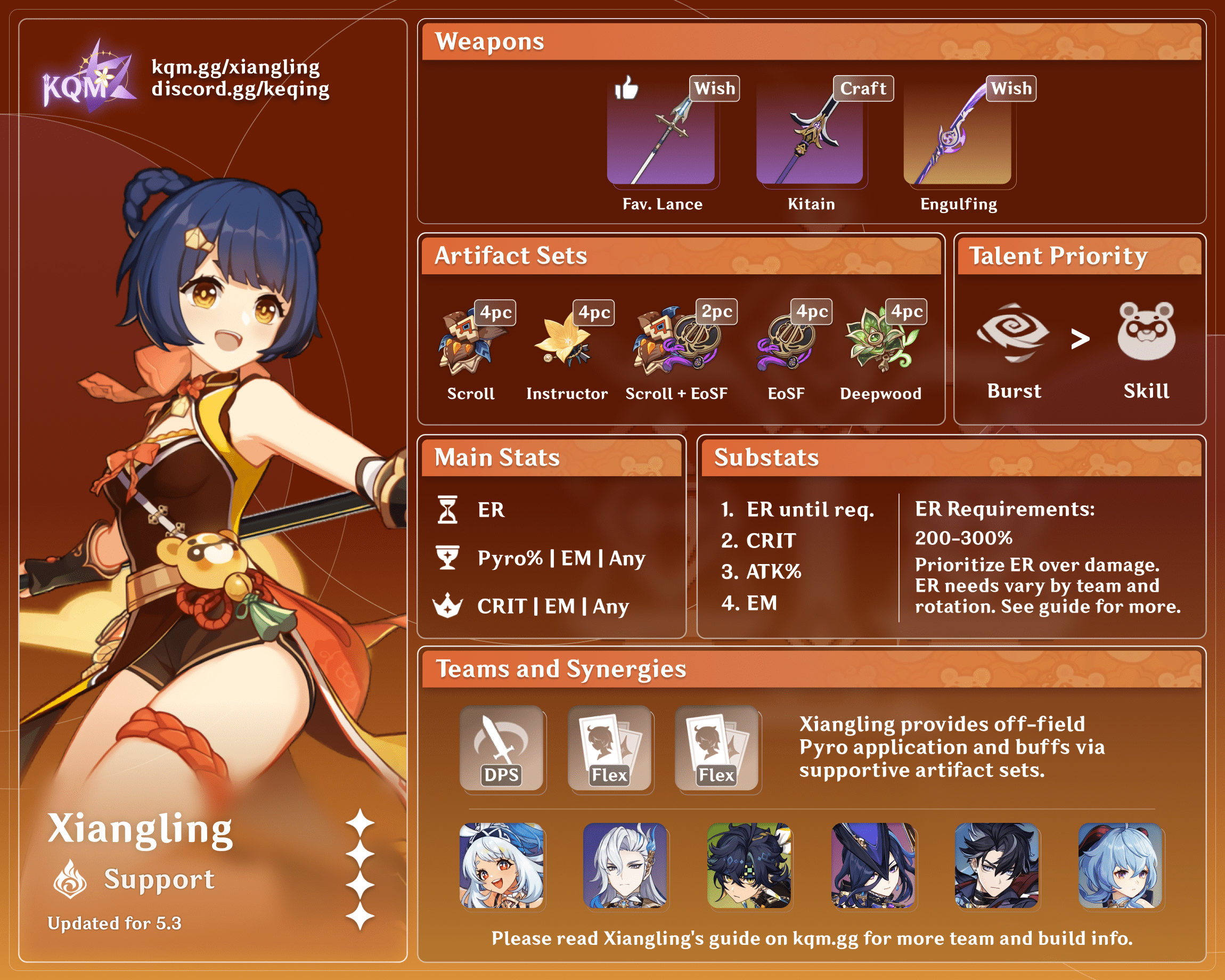 Xiangling’s build and playstyle will vary significantly between teams, depending on the buffs, Energy, and reactions available to her in these teams. This guide will aim to teach you how to build and play Xiangling based on these factors and other specific synergies and nuances, rather than simply listing out instructions for every team possible.