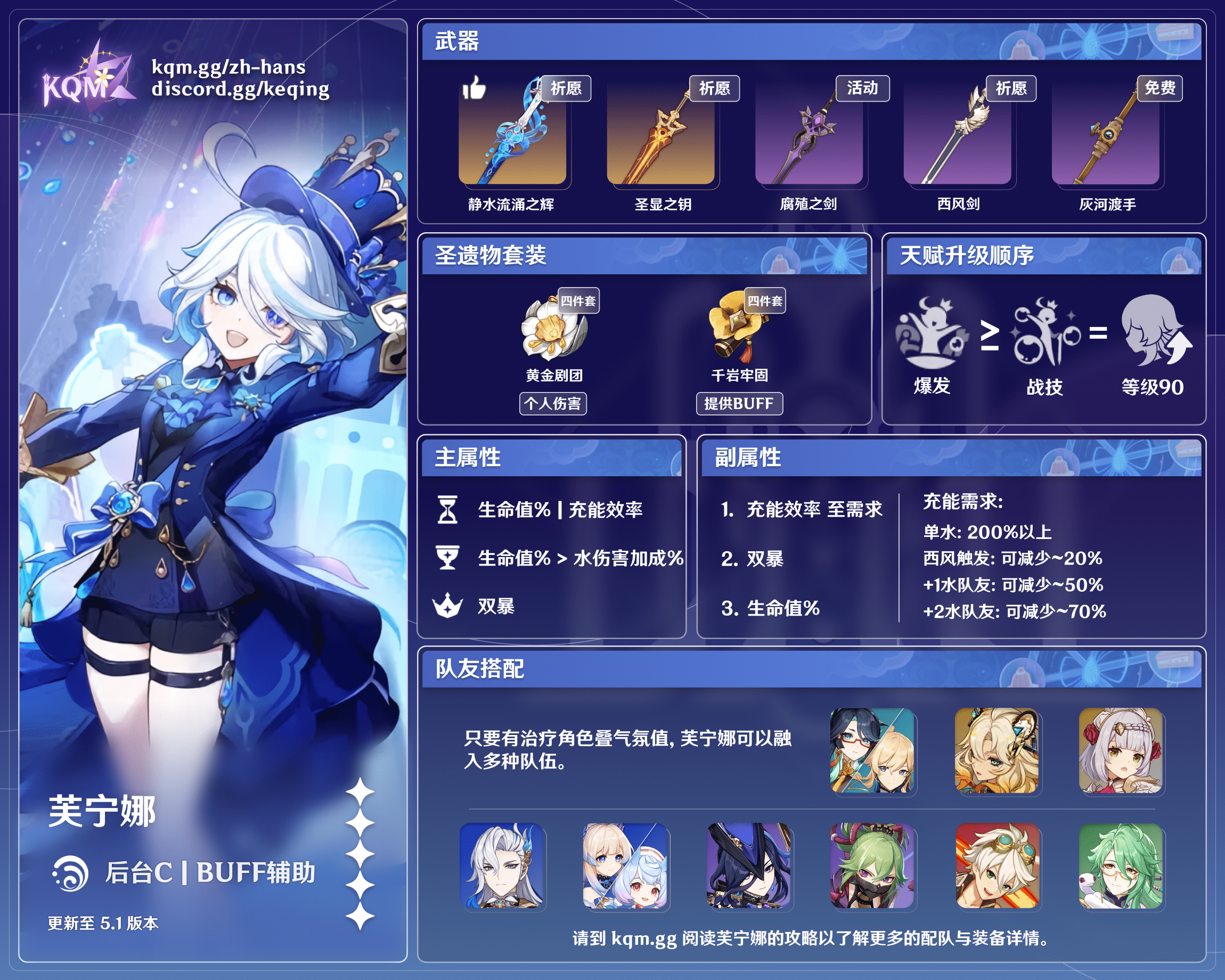 队伍精通BUFF,例如教官,圣显之钥与终末嗟叹之诗有助加强队伍输出,芙宁娜也不需要不调整装备。
