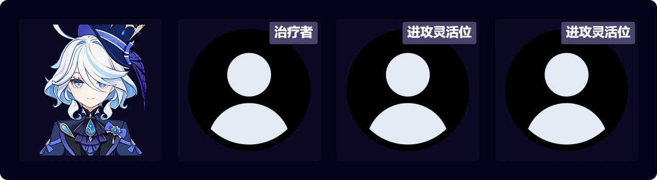 推荐以芙宁娜为中心建立队伍,强调稳定的治疗。除了需要携带合适的治疗者外,剩下的两个位置可以由C或进攻性辅助占据。除非某个角色对队伍有显著辅助能力,并没有必要带上多于一名治疗者;护盾提供者对于攻击容易被打断的角色仍然有用,但依然不是理想选择。