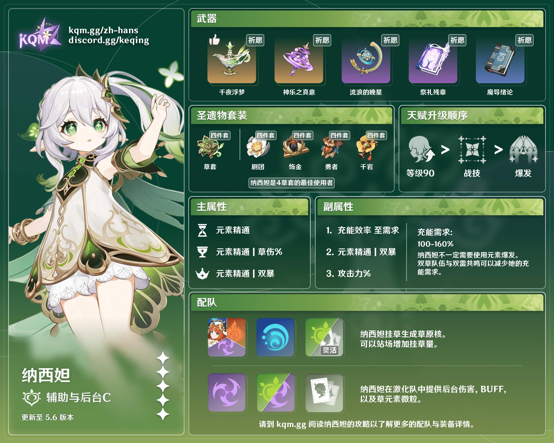 纳西妲是《原神》中一名使用法器的5星草元素角色。她专注于与草元素有关的元素反应,能够在场上或后台穩定且频繁地挂草并提供伤害。此攻略中包含纳西妲的最佳装备,武器,圣遗物,配队等。