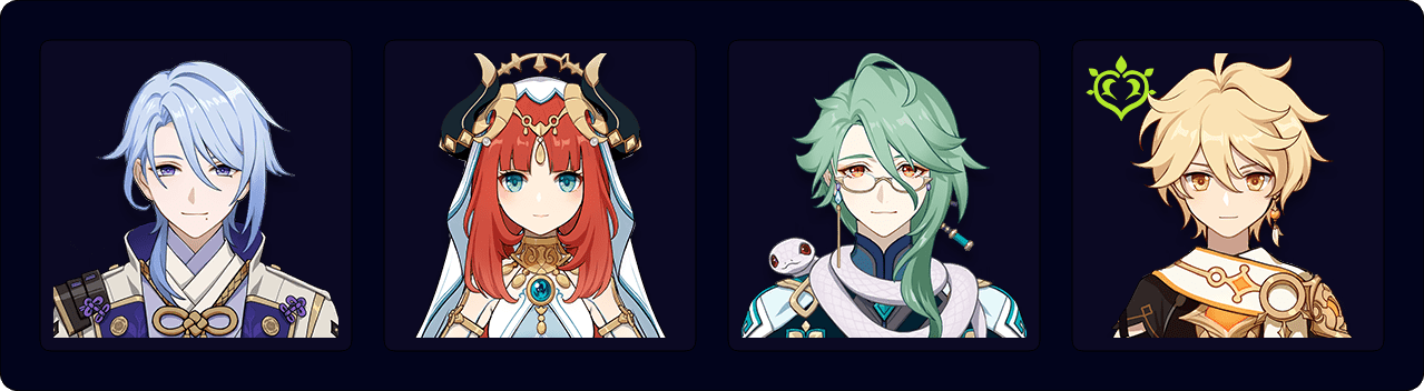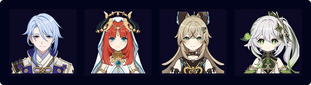 This is one of Ayato’s best teams with Furina. Xilonen is a solid pick for Ayato’s Mono Hydro teams as she consolidates both healing and buffs. This role consolidation is especially valuable here since Ayato has no way to stack Furina’s Fanfare himself and would otherwise have to trade a dedicated buffer for a healer.