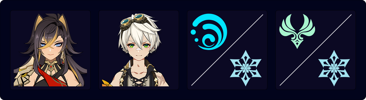 ![]() Ayato | Ayato provides both on and off-field Hydro application in a large area. If you find yourself needing someone to spend time on-field, Ayato can work quite well. When he is on-field with both his Burst and Skill active, his Hydro application can be quite fast, with the caveat of requiring lots of ER in situations where he can only use his Skill once. |