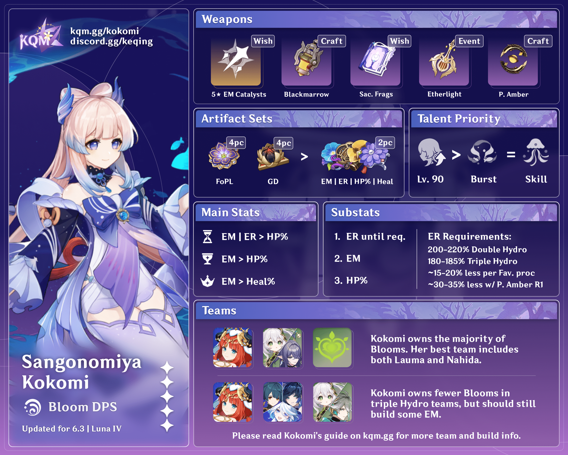 Currently, Kokomi can be played both as an on field enabler or an off field hydro unit. Both have their strengths and weaknesses but they are largely team dependent, so they will be somewhat combined in this guide.