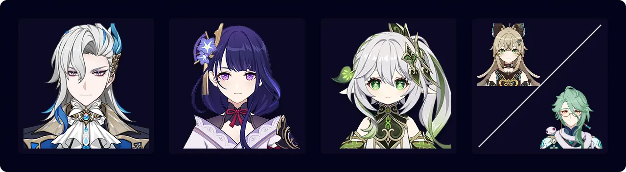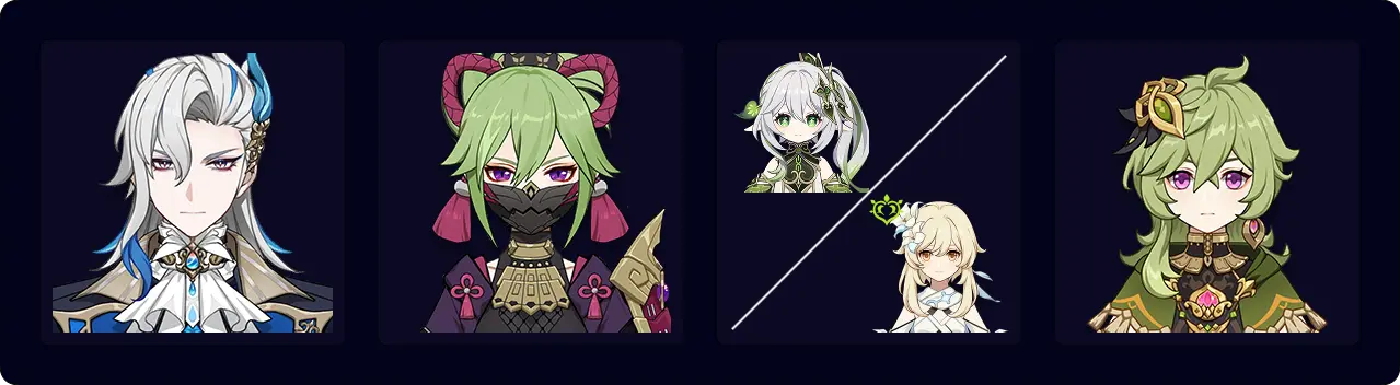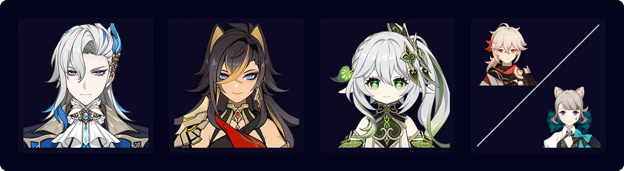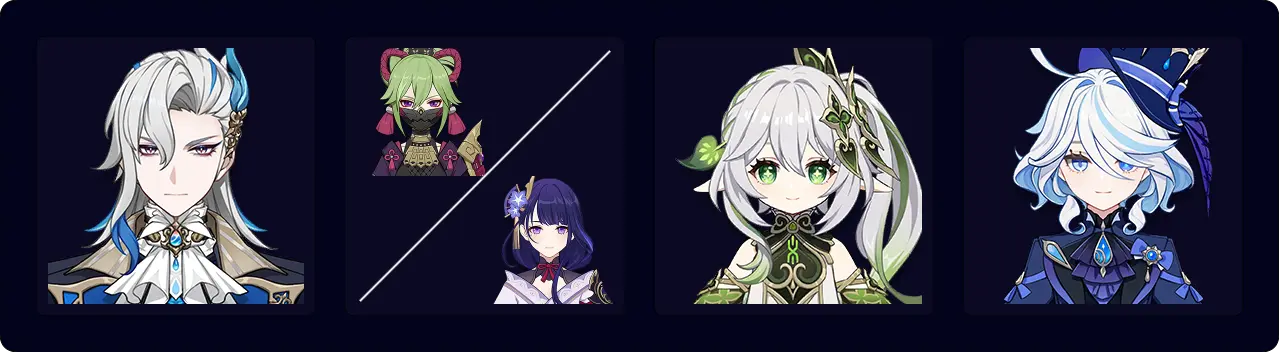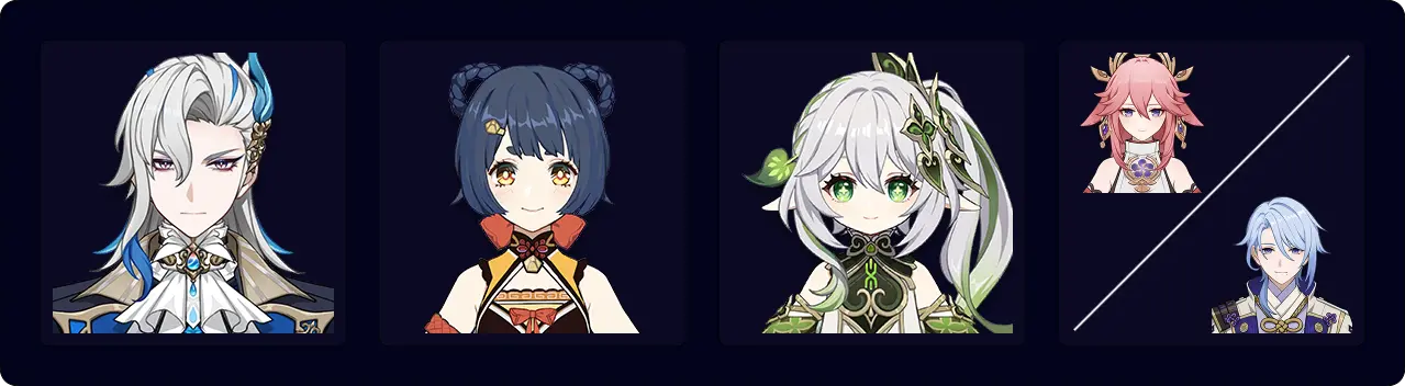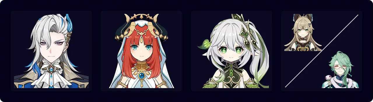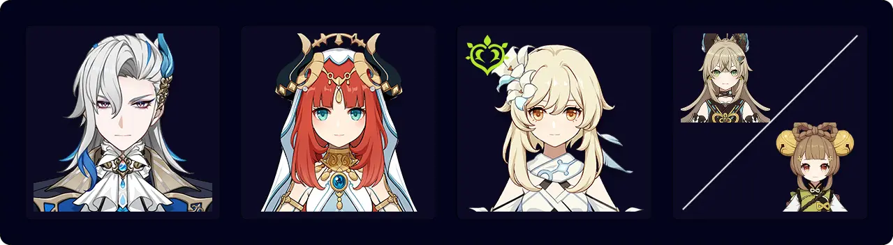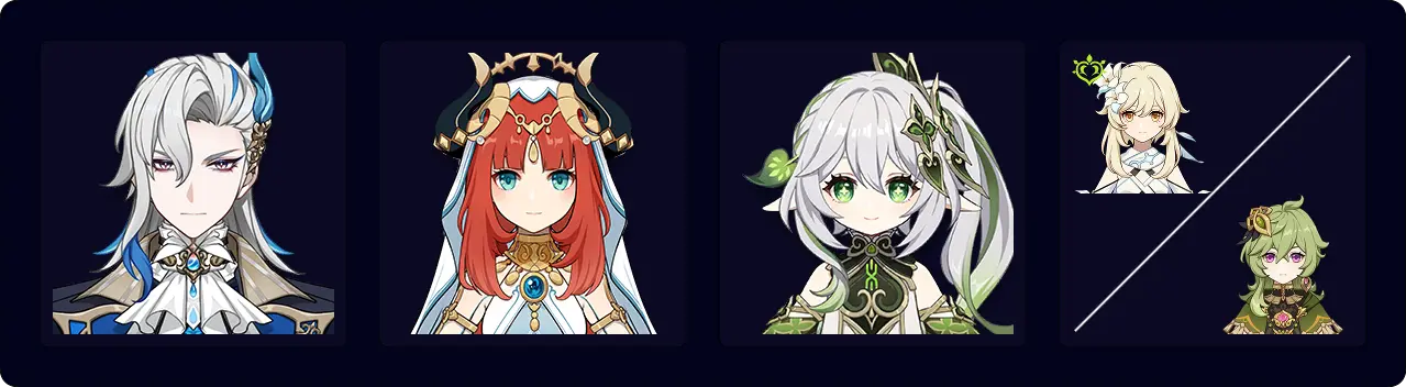 Nahida Dendro Application / Buffing / Off-Field Damage | Rating: S (Hyperbloom, Bloom) / A (other teams) Nahida’s Skill offers off-field Dendro application that is unmatched in strength and consistency. Since she is the only source of 1.5U Dendro application, she is the only Dendro option able to consistently sustain Burning to enable Forward Vaporize. Her Burst also offers up to 250 EM to increase Neuvillette’s damage in teams where he benefits from EM. It can still be used for i-frames or to fill up rotation time in teams where EM is less valuable. The long duration of Nahida’s Skill easily accommodates Neuvillette’s field time requirements, and its large range gives him appreciated mobility. Its chainmechanic and pseudo-grouping is beneficial in multi-target content, and can apply Dendro without requiring Neuvillette to remain within a certain range of enemies. In turn, Neuvillette’s flexibility mitigates Nahida’s issues in multi-wave content. In other teams, Nahida might disrupt rotations in order to reapply her Skill when a new wave of enemies spawns, but this is largely a non-issue in Neuvillette’s teams. Recommended gear: Nahida’s build remains the same even with Neuvillette on the team. She should always equip 4pc Deepwood in teams that deal Dendro damage, and can hold Thousand Floating Dreams if Neuvillette benefits from the EM. Notable investments: Nahida’s C2 is a significant damage increase to all her teams with Neuvillette, especially Bloom and Hyperbloom. Since his Burnvape teams with Nahida and Xiangling can accommodate an Electro flex (e.g., Yae Miko), he can slot one in for the DEF decrease as well. A Thousand Floating Dreams is both a nice increase to Nahida’s personal damage and can buff Neuvillette if he benefits from the EM. Recommended Playstyles: Vaporize / Hyperbloom / Bloom |