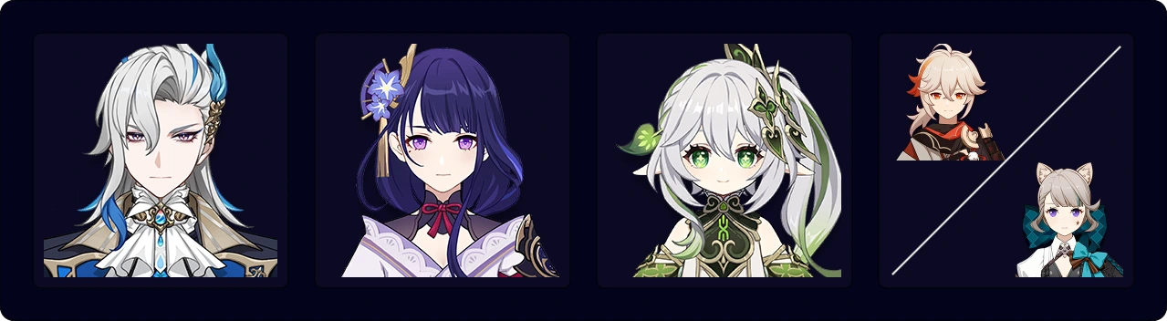 ![]() Raiden Hyperbloom / Off-Field Damage | Rating: S (Hyperbloom) / D (other teams) Neuvillette does not do well in dual carry teams, but Raiden can instead play as an excellent Hyperbloom trigger. Her Skill also offers some Energy and a minor Burst DMG Bonus. Its long duration means she often only goes on-field once per rotation. Raiden’s Skill has full uptime in Neuvillette’s 3CA rotations, and in 4CA rotations the minor downtime is near negligible. Combined with her Skill’s short cast time, this makes her field time requirements minimal. Raiden can also viably play as an off-field damage dealer in non-Hyperbloom teams, but this is a strict downgrade from actual off-field damage dealers (e.g., Fischl or Yae Miko). Regardless of investment, her Skill never makes up a significant portion of the team’s damage. Recommended gear: Raiden uses her standard EM build if she triggers Hyperbloom, 4pc Scroll if the team does not have a holder yet, otherwise she builds for personal damage. Since she does not Burst, sets like 4pc Golden Troupe are recommended. ATK and CRIT weapons gain value over ER% weapons, the exception being in teams where Neuvillette benefits from added Energy, where Favonius Lance is the stronger pick. Notable investments: None. Recommended Playstyles: ★ Hyperbloom / Vaporize - with Dendro Viable Playstyles: Electro-Charged / Hypercarry |