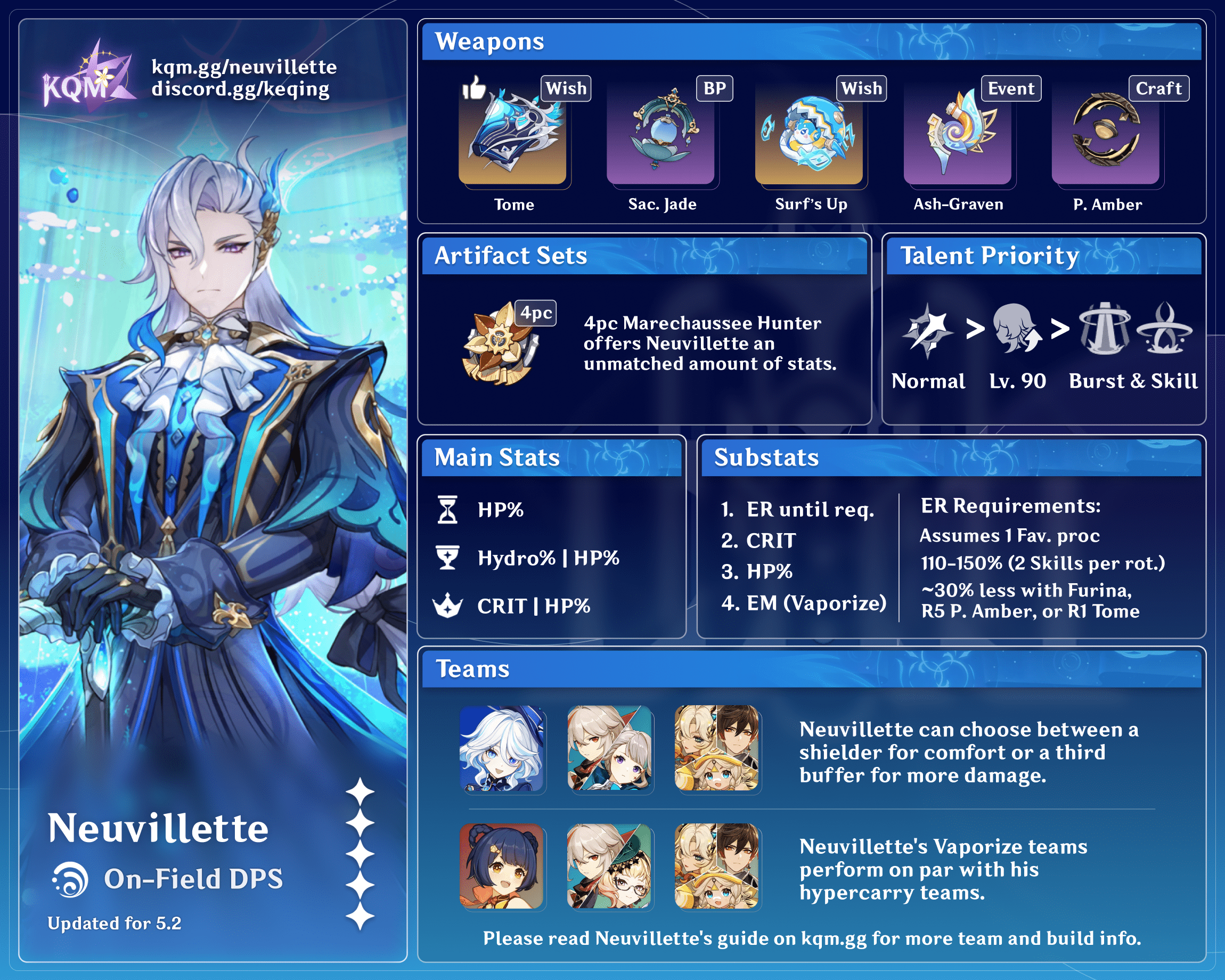 Check out the Neuvillette Rotation Sheet for example teams and rotations, and Gearing Neuvillette’s Supports for a more detailed gearing breakdown (including higher-investment options). For characters whose builds don’t change with Neuvillette, check out their linked guides for more build information.