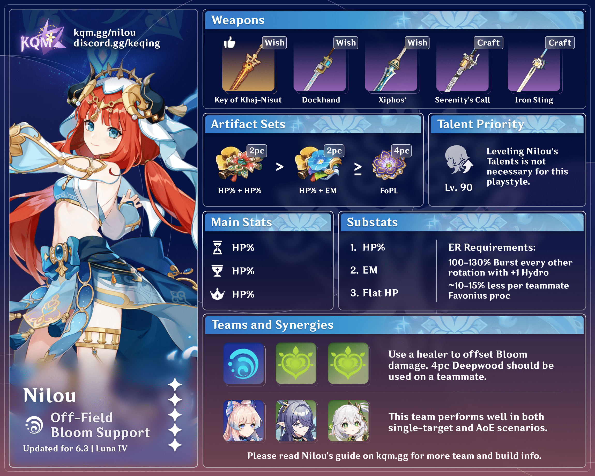 Overall, the choice of obtaining Key and committing to further upgrades for Nilou should be decided based on your willingness to improve Bountiful Bloom teams’ single-target DPS and to let Nilou pack other stats like EM and ER% once Key of Khaj-Nisut allows her to cap out her A4 Passive.