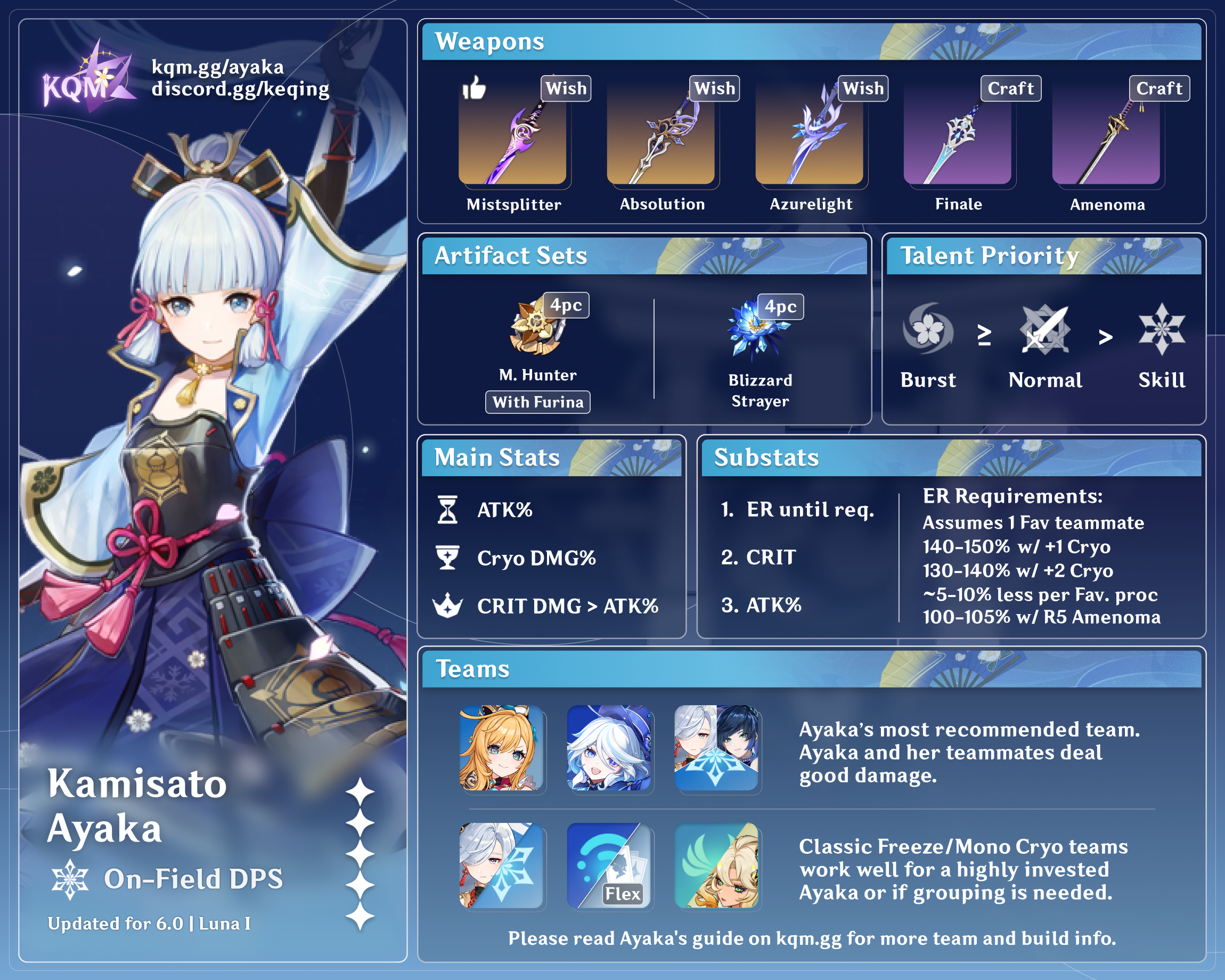 Cryo teammates enable Cryo Resonance and reduce Ayaka’s ER requirements. Preferred teammates bring buffs, healing, or high personal damage.
