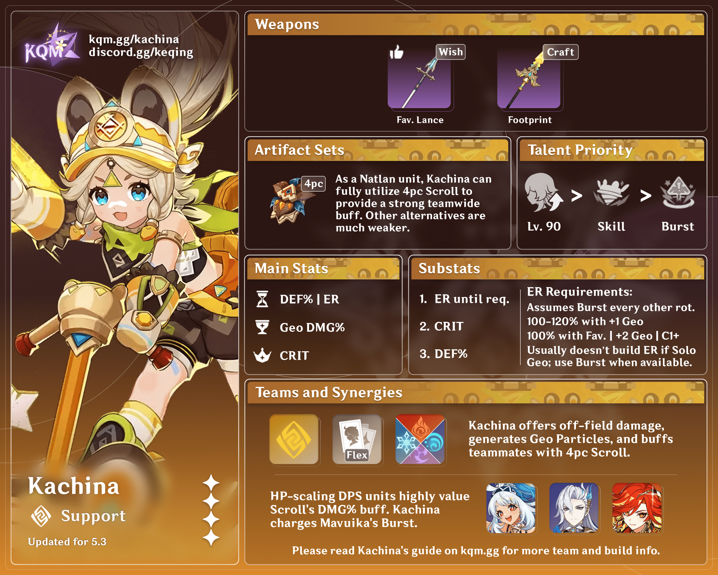 Kachina provides a Geo DMG% buff via 4pc Scroll of the Hero of Cinder City, Geo Particles, and some off-field damage for Geo teams.