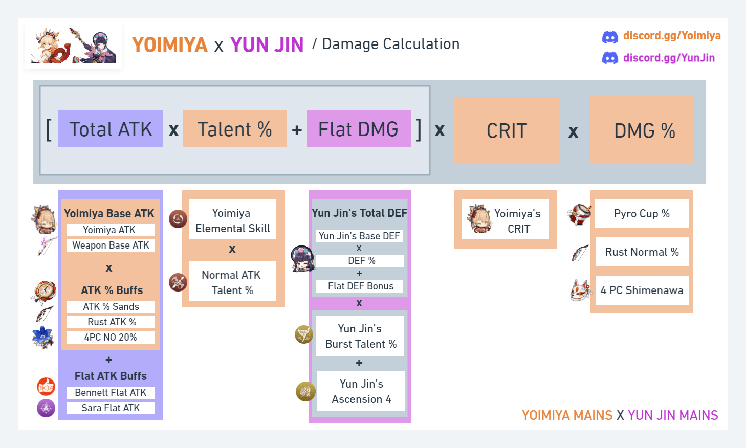 Yun Jin’s Additive Base DMG Bonus does not factor in a character’s Normal Attack Talent multipliers nor their ATK stats. It instead scales with the rest of their stats, such as DMG%, CRIT, and any other multiplicative stats like enemy RES Shred and Vaporize / Melt multipliers. Here’s an infographic showing where her buff is applied when calculating damage: