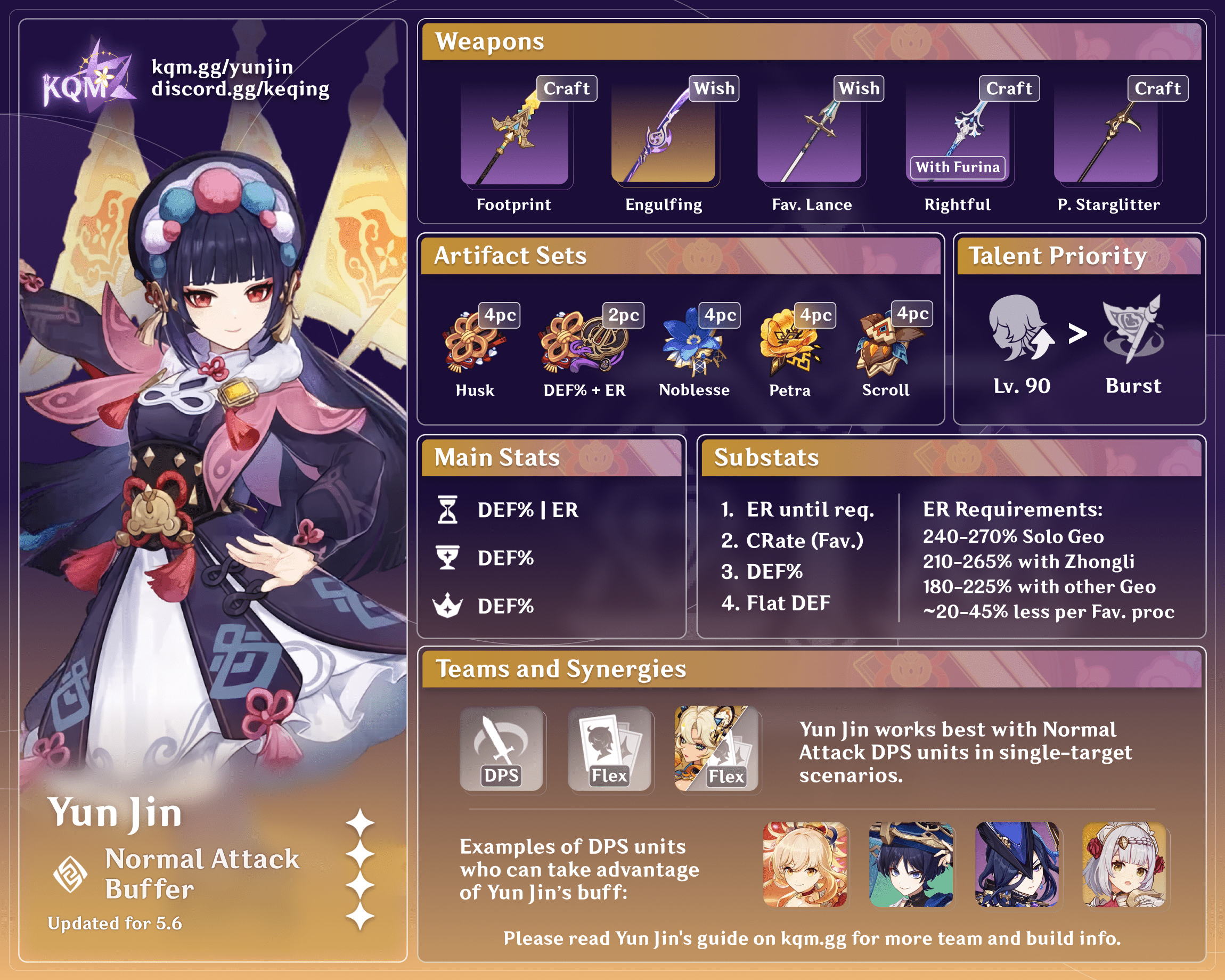 The following table assumes Favonius procs and different Yun Jin Skill casts when applicable. Each additional Favonius proc reduces Yun Jin’s ER requirements by 10–30%.