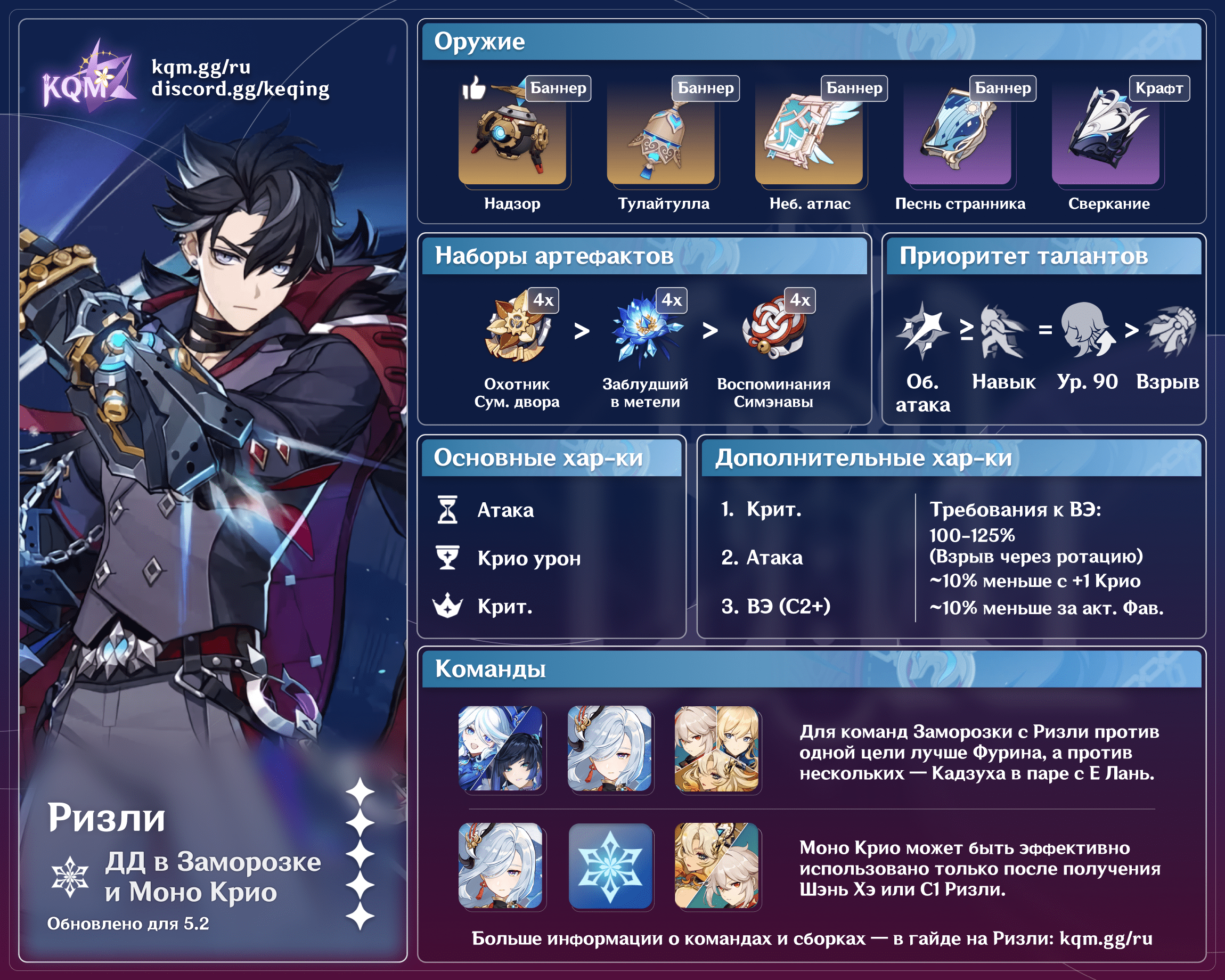 ![]() Кадзуха | Кадзуха — ведущий Анемо персонаж поддержки для отрядов с Ризли благодаря баффу Крио урона от его таланта В4, стяжке врагов и низкому времени отката способностей. Так как Ризли должен быть на поле все время действия его навыка, Кадзухе следует Рассеивать Крио как можно позже в ротации ради более длительного действия эффекта Тени. |