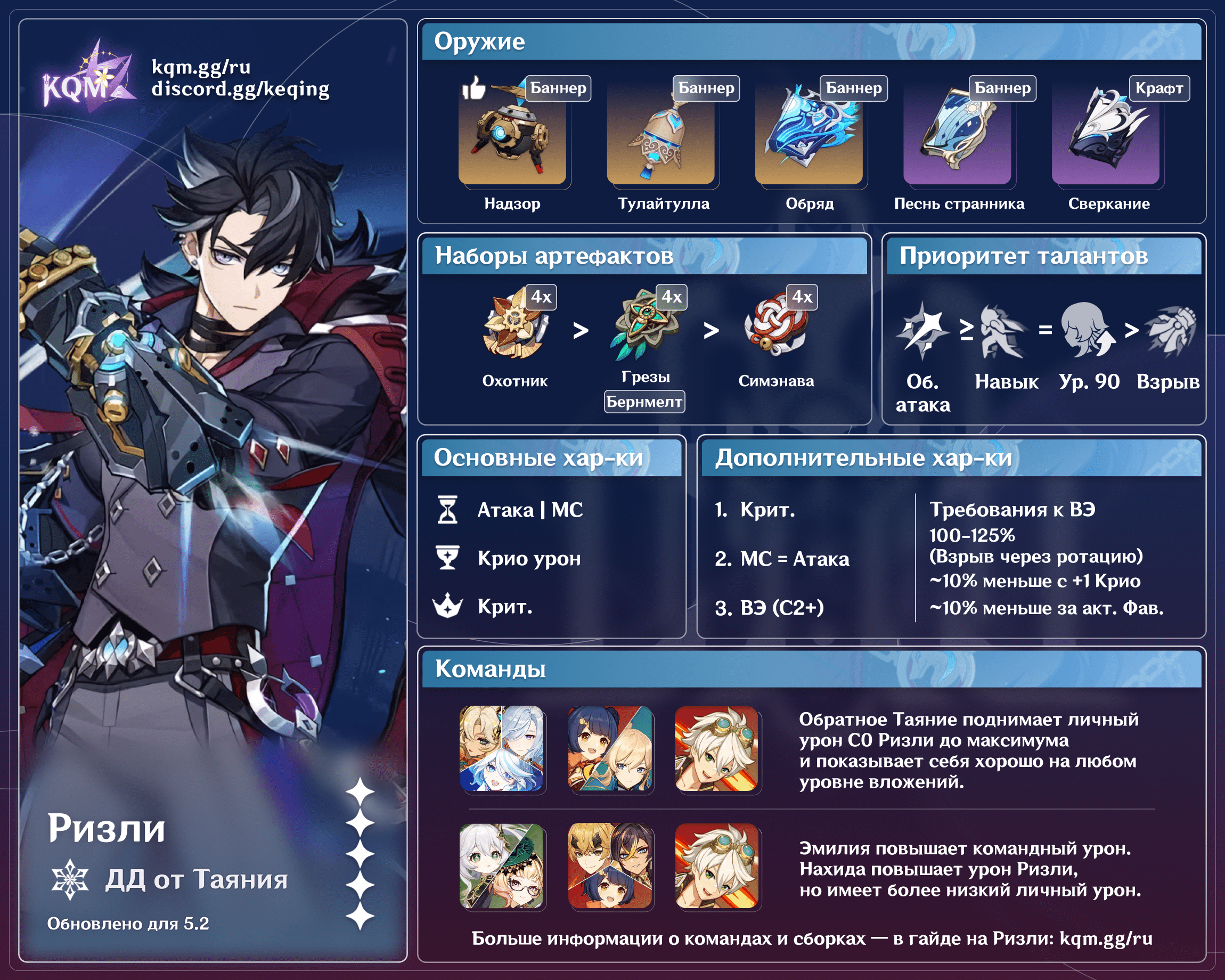 Ризли — 5-звездочный Крио каталист в Genshin Impact, наносящий урон усиленными обычными и заряженными атаками. Из этого краткого гайда вы узнаете о лучших сборках, оружии, артефактах и отрядах для Ризли.